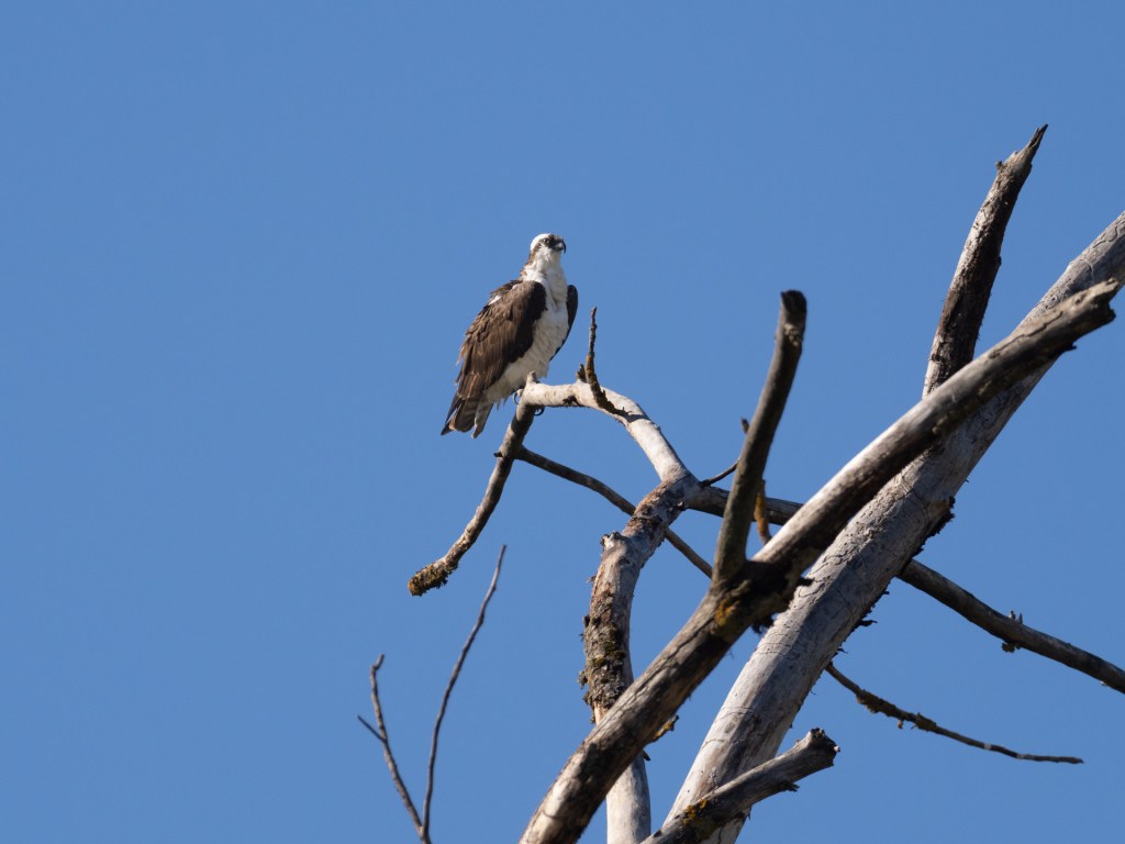 We spotted an adult Osprey (perhaps one of the Boulders adults as it was near the nest) perched in a tree along the river, screaming out an alarm call at another Osprey flying overhead.
