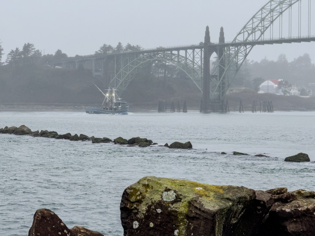 It was foggy much of the week, as in the photo above, which shows a fishing boat, the Lady Law, heading into port at Yaquina Bay in Newport in the early afternoon.