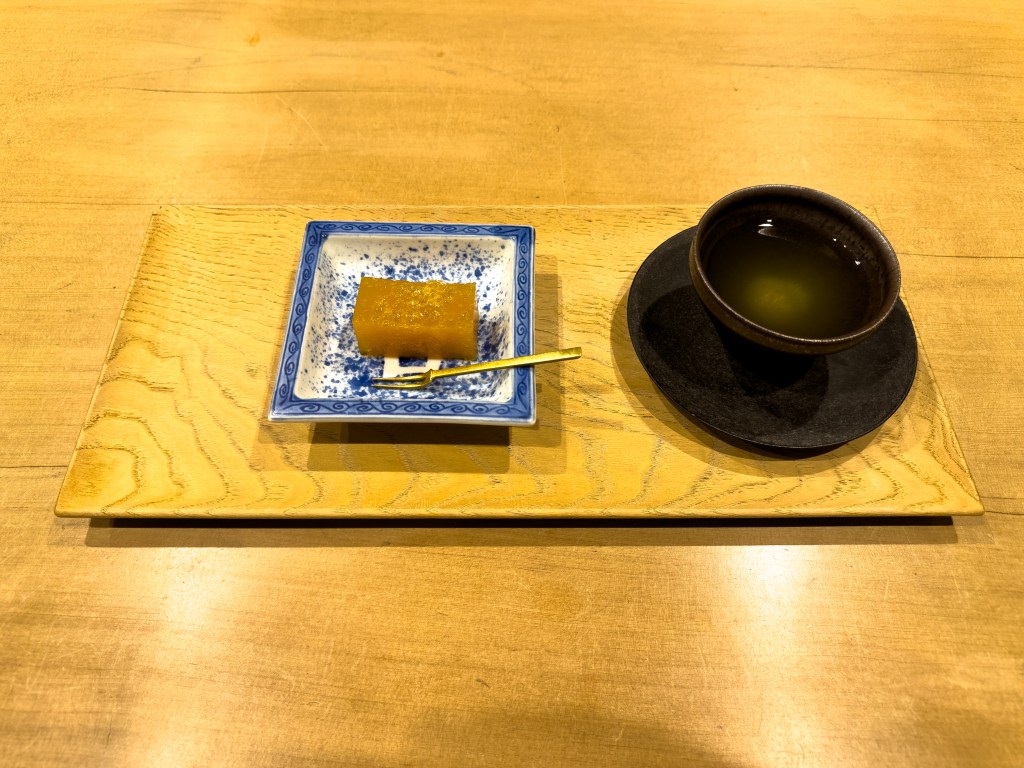 The final course of our lunch at Mokubee featured a pairing of a Japanese jellied dessert with green tea (sencha).