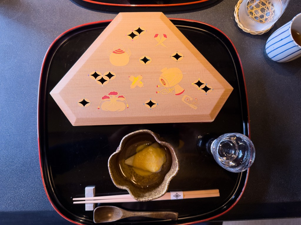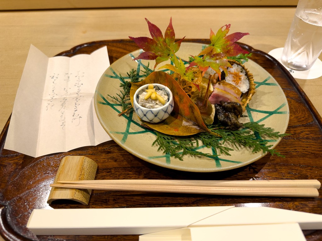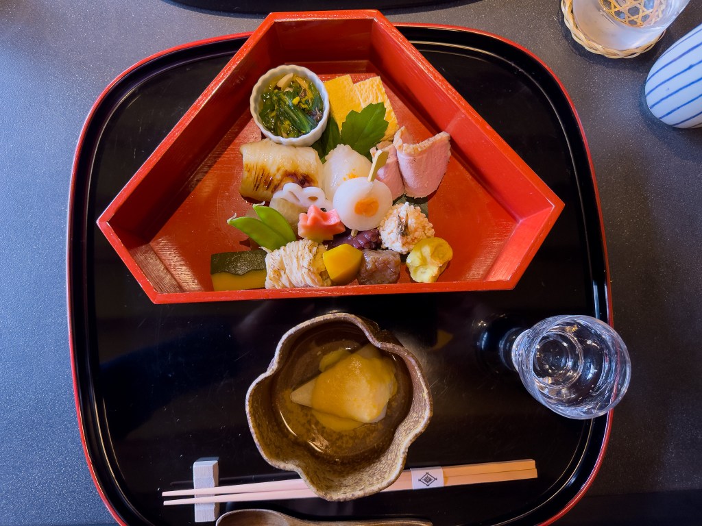 In December 2022, we enjoyed an exceptional meal at the Kyoto restaurant Kikunoi Honten, and wrote about it at this link. In November 2023 Kikunoi Honten was fully booked, but we had a delicious lunch at a nearby cafe, Salon de Muge overseen by the same chef who owns Kikunoi Honten, Yoshihiro Murata. One of the courses was presented in a beautiful box, as shown below.