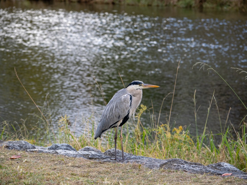 The tall heron that looks like a Great Blue Heron in the above photo is a Gray Heron (Ardea cinerea). The Gray Heron is smaller than the Great Blue Heron (Ardea herodias) and has some coloration differences, according to the Cornell Lab of Ornithology’s Birds of the World website.