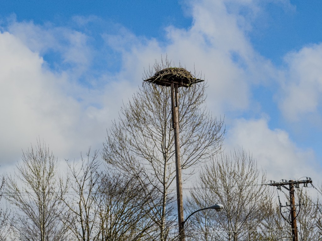 There is an Osprey nest on a platform consisting of a warehouse pallet secured to the top of a utility pole here in my Eugene, Oregon, neighborhood that is conveniently located for observation from ground level. I refer to this as the Boulders nest.