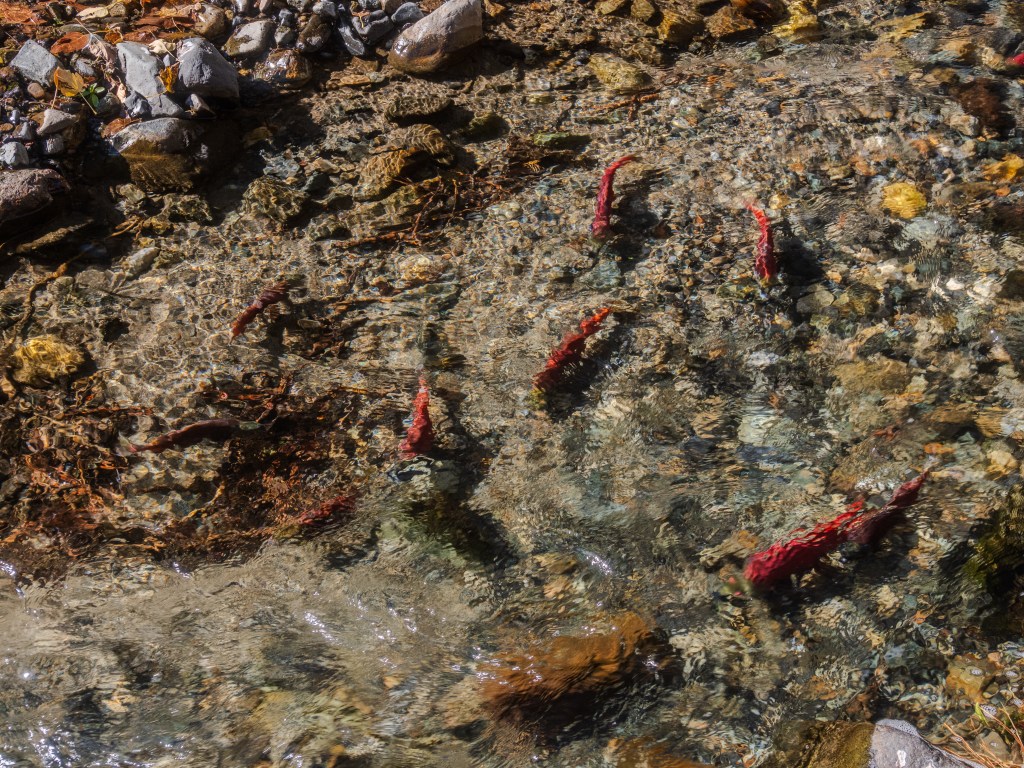 While picnicking at Wallowa Lake State Park, we noticed signs along the riverbank cautioning people not to disturb the spawning Kokanee Salmon. Intrigued, we walked carefully to the river to look for the fish. Considering their daunting challenges, we were encouraged to see fish spawning in the wild.