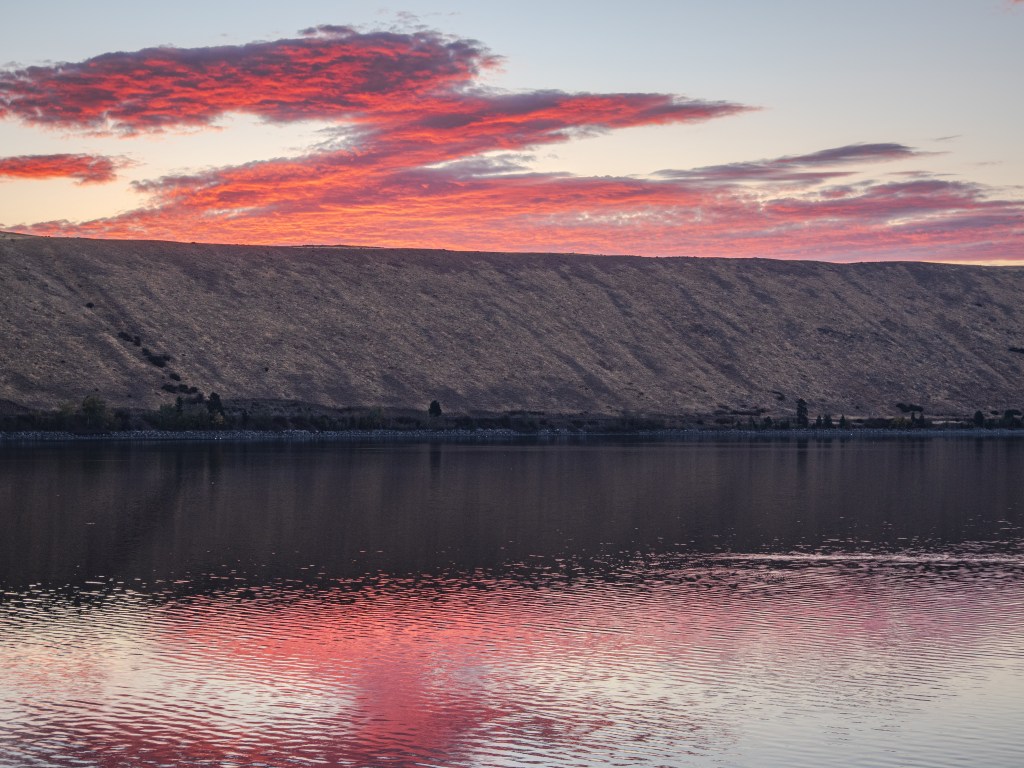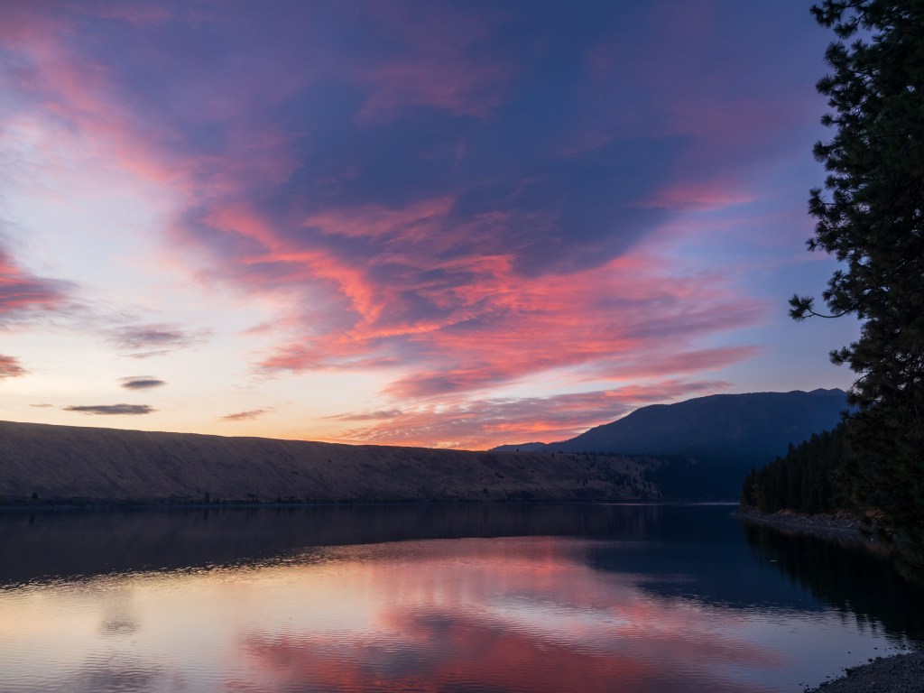Before the sun rose above the East Moraine on our last day at Wallowa Lake, it illuminated the clouds with rich colors to the southeast, which brought the silhouette of the Wallowa Mountains into view. I rushed outside to record the fleeting scene.