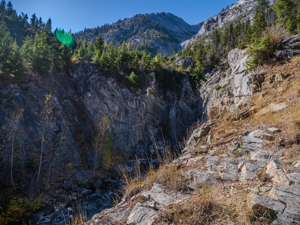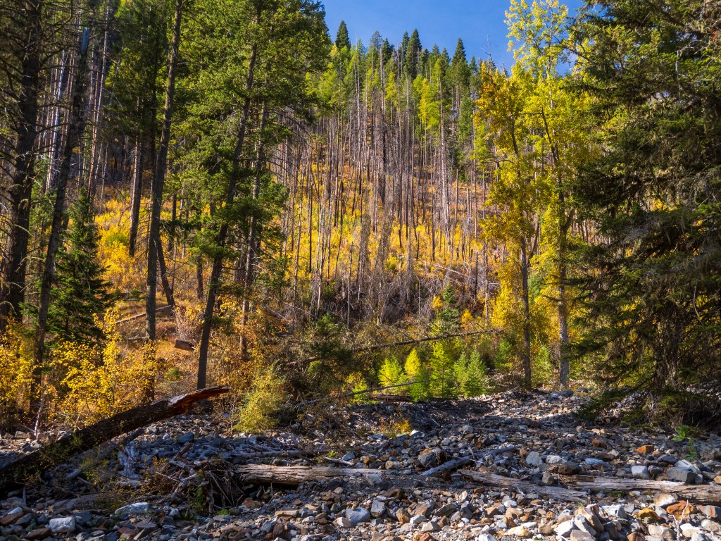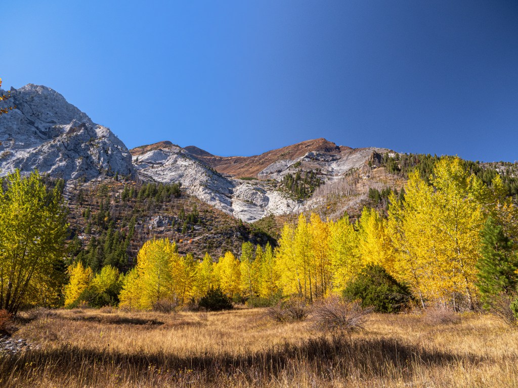 The backlit yellows of the aspen and larch trees drew our eyes. On prior trips, I attempted to capture photos at this location but felt frustrated by the chaos of tree trunks, harsh light, and shadows. This time, it felt easier to find a composition to work with.